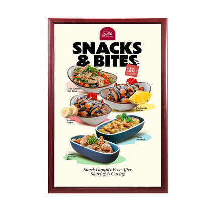 The patented, wall mounted restaurant menu frame is an ideal choice for restaurants that require the elegance and warmth of a wood profile that comes in 10 standard popular wood finishes for wide ranging interior decors, to compliment and enhance their restaurant’s interior design.