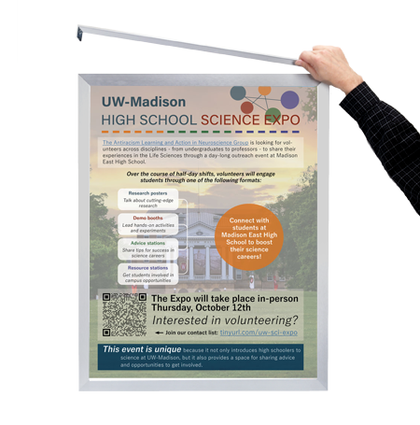 The Wide Face Poster SwingFrame has proven to be our most popular wall-mounted poster frame profile, with its simple, 1" slightly curved contemporary style metal frame designed for quick change functionality as well as its appealing presentation.