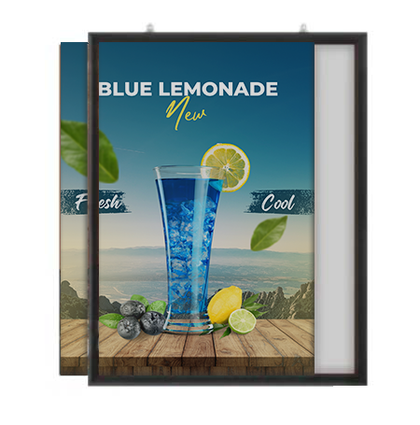 The high-quality, 22 x 28 slide-in frame with 1" wide metal frame profile is quick changing. Updating and changing your graphic typically takes less than a few seconds. By hand, slide out the old, then slide in the new graphic between the protective overlays provided. It's that easy!