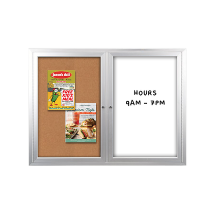 With this indoor combination board, you can use the cork board as a typical pinboard and be creative at the same time with your messages and announcements by ordering a combo board with a magnetic dry erase white board or black board. These 2-door wall mount enclosed cork bulletin boards have an eye-catching appeal in all kinds of interior public and workspace environments.