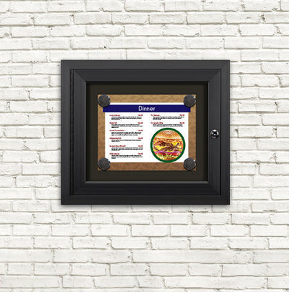 2" Deep Wall Mounted Menu Boxes. This slim restaurant menu display cabinet comes in four metal menu box finishes. Included within the cabinet is a natural cork board panel is for pinning your menus. The 2" deep wall mounted outdoor display cases are weatherproof. A cam lock on the front of the case secures the frame door. Seven standard outdoor menu case sizes are available to display your 8 1/2" x 11" Menus.