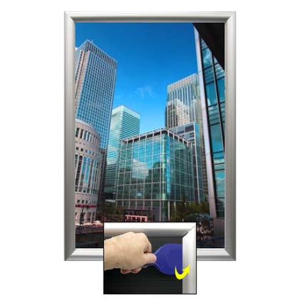This front-loading aluminum snap poster frame has radius corners and comes in 4 standard finishes. Radius snap frame style is ideal for high traffic areas where rounded frame corners are desirable. These snap frames are often used as elevator frames; in the elevator and by the elevator doors.
