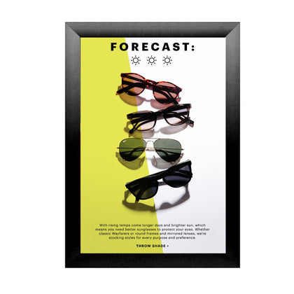 • Quick-Changing, all 4 frame rails snap-open for easy poster changes