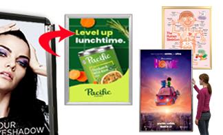 Our biggest-seller, poster snap frames "SwingSnap" Poster Frames, come in over 100 standard sizes from small to extra-large snap frame sizes. Snap Frame Sign Holders, also referred to as clip frames or flip-up frames, come in numerous styles, including mitered or radius corner, security screw, locking snap frames. We also offer backlit and edge-lit LED snap frame lightboxes.