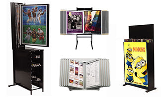 Swing Panels are another line of poster displays and art display fixtures we offer. These are multi-panel posters and photo display panels that flip with ease, like turning a page in a large book and designed to exhibit numerous posters, art, and prints. Choose from wall-mounted, freestanding, and countertop designs. Additionally, we offer exhibit panels, rolling exhibit boards, tack board displays, floor bin displays, print bins, art bins, poster bins. For prints, clear print protectors and poster sleeves are available in various sizes.
