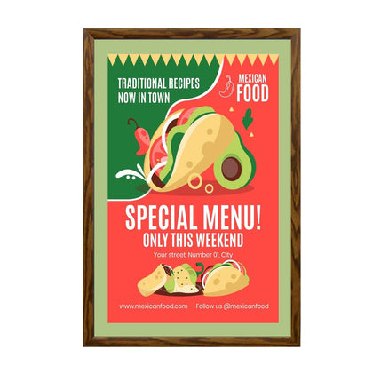 Cost effective, wall mount wood snap frames for small and large signage projects are accentuated with a simulated wood wrap finish and are the ideal choice for many quick change display applications that require an interior touch with a wood finish.