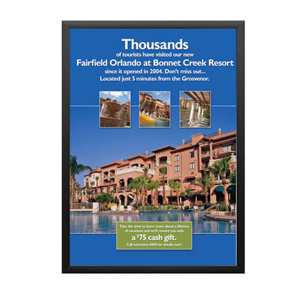Aluminum Snap Frames 20x28 are the most popular changeable poster displays. Simplicity and low cost are the primary reason as well as offering the most popular 20 x 28 poster frame finishes, black, silver and gold that fit comfortably within numerous interior retail store decors. One 20 x 28 poster display or several 20x28 sign frames or thousands of 20x28 frames, “poster snaps” remains the favored choice for small and large businesses, retail stores, corporations, institutions and as a POP display signage fixture. Wall mount and snap open your 20x28 snap frame, update your 20 x 28 poster, and snap shut. That's it!