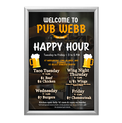 7 Metal Finishes are designed to compliment numerous commercial and residential interior decors. Choose from these metal frame finishes: Satin Black, Satin Silver, Satin Gold, Polished Black, Polished Silver, Polished Gold Frame or Contrast Grey.