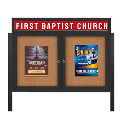 Outdoor Enclosed 42x32 Bulletin Cork Boards with ILLUMINATED HEADER (with Radius Edge & Leg Posts) (2 DOORS)