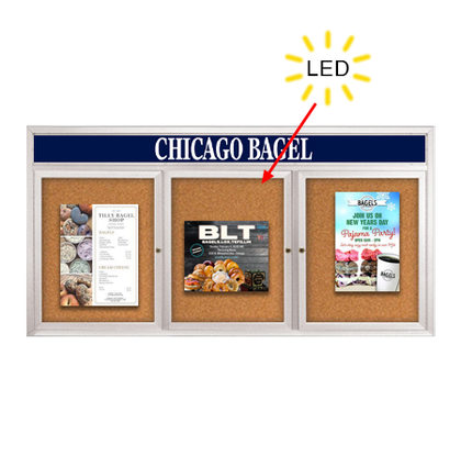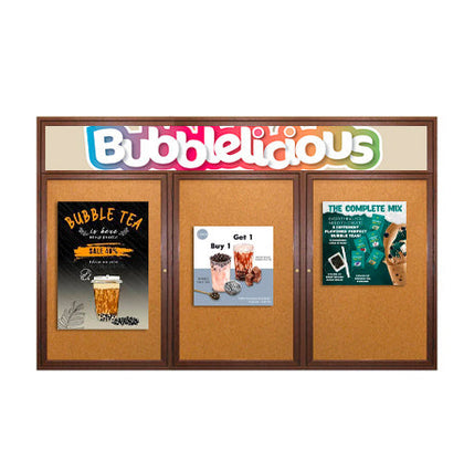 72 x 30 WOOD Indoor Enclosed Bulletin Cork Boards with Interior Lighting (3 DOORS)
