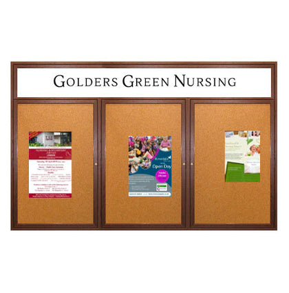72 x 30 WOOD Indoor Enclosed Bulletin Cork Boards with Message Header (3 DOORS)