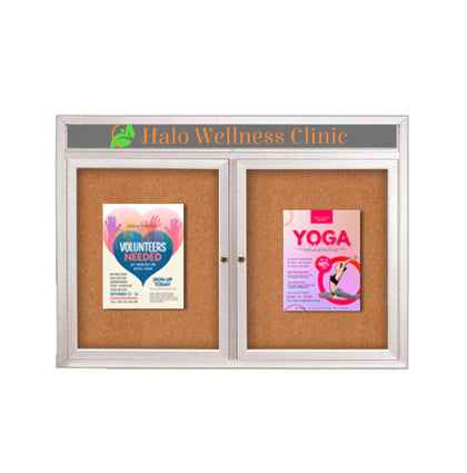 Indoor Enclosed Bulletin Boards 72 x 30 with Rounded Corners 2 Doors & Personalized Header