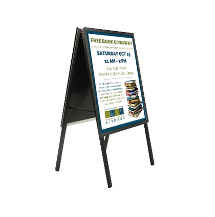 A sidewalk stand sign holder can be used by restaurants, medical offices, libraries, retail stores, theaters, and many other businesses and organizations. Each one has a snap frame that lets you do fast poster changes. All four of the frame rails snap open to easily remove inserts and load the new one into the front. It takes seconds to update signage, so your customers and clients always have the latest info.