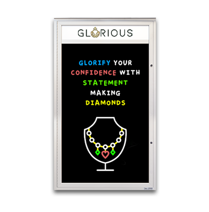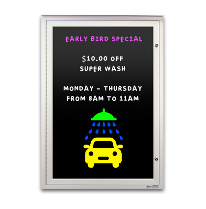 If your message display board needs to be visible both day, night, or in dimly lit areas, another model you can order is a lighted markerboard display case. It comes with a long-lasting fluorescent bulb or energy-efficient, long-lasting bright LED Lighting, with or without a message header. The illuminated wall-mounted display case is 3 1/8" deep.
