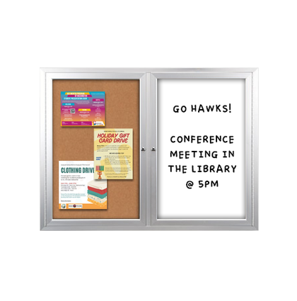 With this indoor combination board, you can use the cork board as a typical pinboard and be creative at the same time with your messages and announcements by ordering a combo board with a magnetic dry erase white board or black board. These 2-door wall mount enclosed cork bulletin boards have an eye-catching appeal in all kinds of interior public and workspace environments.