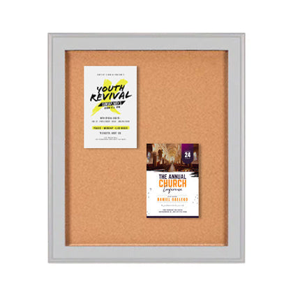 Unlike other enclosed bulletin boards, our Free Standing Enclosed Cork Board's sliding gravity lock and single-sided hinges are hidden by our patented SwingFrame design. All that a passerby will see is the message you post in the Bulletin Board Display and its aesthetically pleasing 1 3/8" wood frame profile.