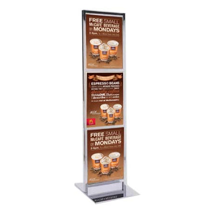 A multi-tier poster stand is an excellent way to make the most of your indoor spaces. Now you can display all of your advertisements using only one free standing sign holder. We have two and three-tier display stands, including: