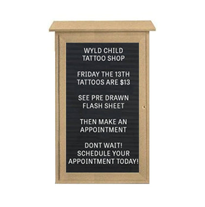 Regardless of your outdoor location, this outdoor enclosed letter board will not only excel at displaying your Messages, Announcements, Events, Schedules, Show Times, but it can stylistically fit into your outdoor location with 6 Faux Wood Style Finishes: Sand, Light Grey, Weathered Wood, Woodland Green, Cedar & White. With this , you can also order a Optional Vinyl Letter Board to enhance the style of your outdoor notice board. There are 5 Popular Colors available: Burgundy, Black, Barcelona Blue, Hunter Green & Grey.