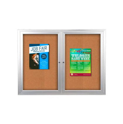 The two doors on the SwingCase outdoor enclosed bulletin board 72 x 30 is built with solid continuous hinges and secured with front door cam locks (2 Keys are provided). Tempered Glass is available an option.