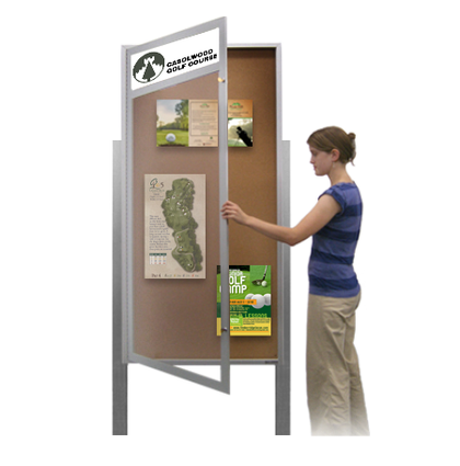 But we know that organizations have a lot of different needs — so we offer a lot of outdoor bulletin boards to meet them. Smaller announcement boards have a single post and cork board floor stands to place by a path or near an entrance. Two-sided outdoor message boards provide double the space. There are message centers with bottom-hinge, top-hinge, side-hinge, and sliding doors. Is one side not enough for everything you have to say? Keep reading for even more possibilities.