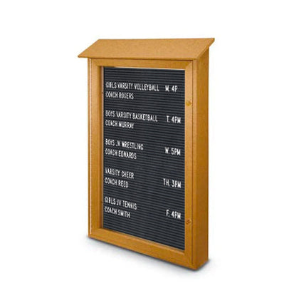 Our wall-mount LEFT-Hinged Single Door Outdoor Letterboard Display features Faux Wood construction, which perfectly replicates the appearance and style of real wood. This allows you to achieve a traditional, high-quality look without the associated upkeep. The cabinet is available in six Faux Wood finishes, allowing you to select the style that best complements your facility's exterior setting.