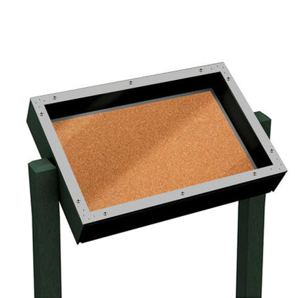 With its Polyethylene design and two posts, this standing bulletin board is perfect for many outdoor locations, like trails and bike paths, that see traffic from both sides. The top of this enclosed bulletin board features a slanted overhanging roof with 8.5 inches of rain coverage. The structure itself is weather-resistant, and the bottom piano-hinged double doors are secured with two CAM locks, meaning your materials will remain safe no matter what. The glass is made of a break-resistant acrylic window. You may choose from a variety of vinyl colors to be fitted over the cork, adding to the flare of your materials. These announcement boards come with two 10-foot posts.