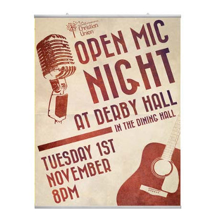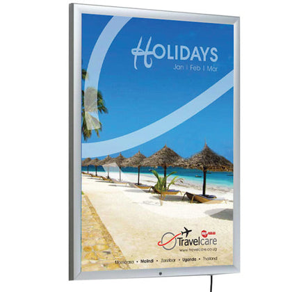 Always an effective promotional marketing sign holder to consider in all kinds of indoor locations. These ceiling hanging snap frame display can have a big impact for sale promotions, notices, and advertisements. Get views from both sides of the sign frame. This indoor ceiling mount frame is displayed in 4 popular portrait size frame; 8.5 x 11”, 11” x 17”, 22” x 28” and 24” x 36”. Print either one or two sign inserts for single or double-sided viewing. Popular Silver Finish Ceiling Snap Frame has a 1” wide metal profile with mitered corners that’s made with durable aluminum. Snap open the frame to quickly and easily front load your signage. Snap Frames come with hanging cables, hooks and mounting screws.