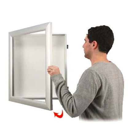 Beautifully built and easily accessible, these SwingFrame empty, wall-mounted shadow box display cases swing open, allowing you to front-load and creatively arrange your items and objects. Although the front frame has a sliding gravity lock hidden from view, a side plunge lock with a key is optional if needed. We offer an attractive range of metal and picture frame styles that come standard with the Designer SwingFrame Shadowbox.