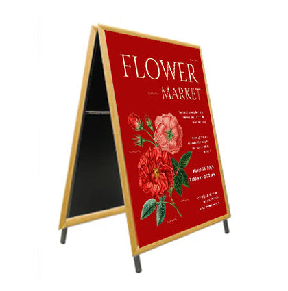 Displaying your 20"x28" size poster, sign or graphic makes the A-Frame floor stand a snap to use when it comes to updating your insert. It features quick changing snap open frames, designed with the classic look of wood; a style that can enhance wide-ranging interior decors. A simulated (faux) wood wrap gives poster frames and sign holders the look of real wood, but at a cost that can meet tight budgets.