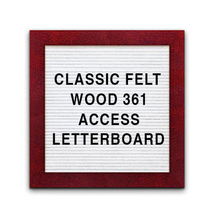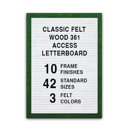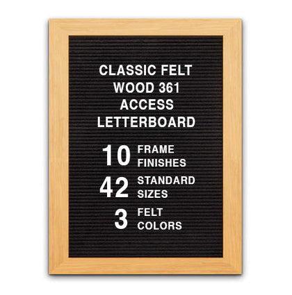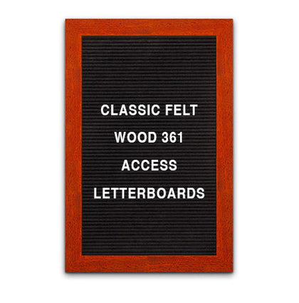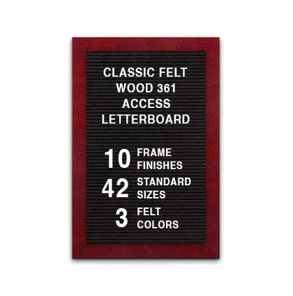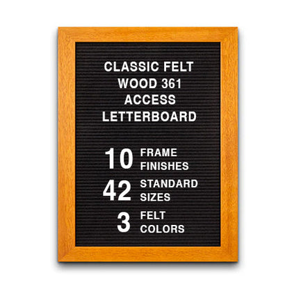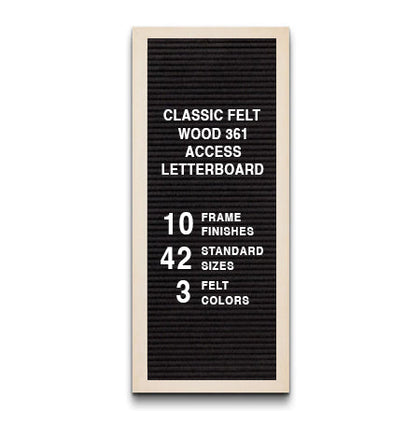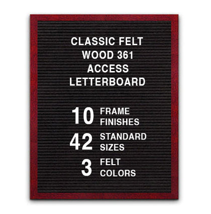 This Access Letterboard™ features a wide 2 3/4" flat frame style face. Natural wood is used to create the 1" deep custom picture frame. Choose from 7 popular wood stained finishes to complement your business, office, or home interiors: Opaque Black, Cherry, White, Mahogany, Honey Maple, Natural Clear, and Rich Walnut.