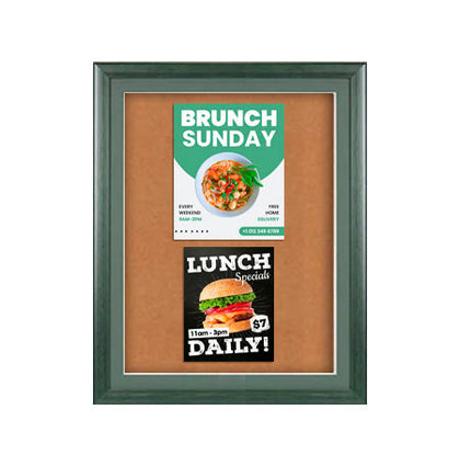 Two door enclosed 60x30 message display boards come in 3 standard wood framed finishes; Walnut, Light Oak, Cherry. You can also add more color to enhance your interior decor: fabric covered cork boards are offered in 10 colors or choose from 4 painted cork colors.