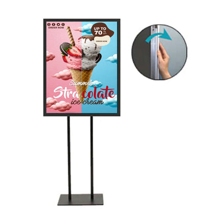 Displaying your 13x19 poster, sign or graphic makes the double pole floor stand a snap to use when it comes to updating your printed insert. It features quick changing, 13x19 snap frames.