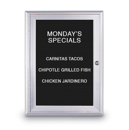 The smooth, sleek, radius-rounded aluminum-constructed cabinet is built to withstand everyday use. It features a full-length piano hinge with a front cam lock on the door. It also features break-resistant clear acrylic windows, making it an ideal changeable letter message board for numerous indoor areas.
