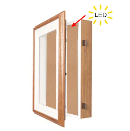 SwingFrame Wall-Mounted Shadow Box with Bulletin Board and 1-inch Usable Cabinet Space, illuminated by LED Lights