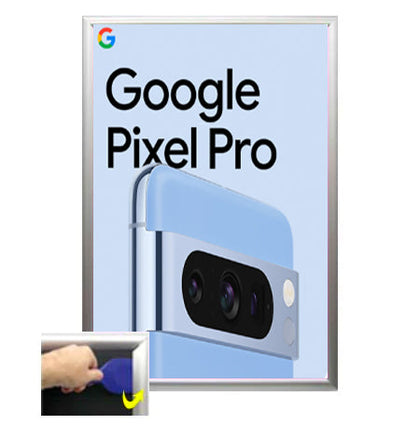 Security "SwingSnaps" 1 1/4" wide mitered snap 24x36 poster frames and sign frames are economical, quick-changing display frames that allow you to secure and change posters and signs with ease. All four sides of these metal snap lock frames "snap-open" with a tamper resistant tool (included). The front-loading, snap frame, aluminum poster display with the easy snap shut frame feature provides posters with a tight, secure wrinkle free grip.
